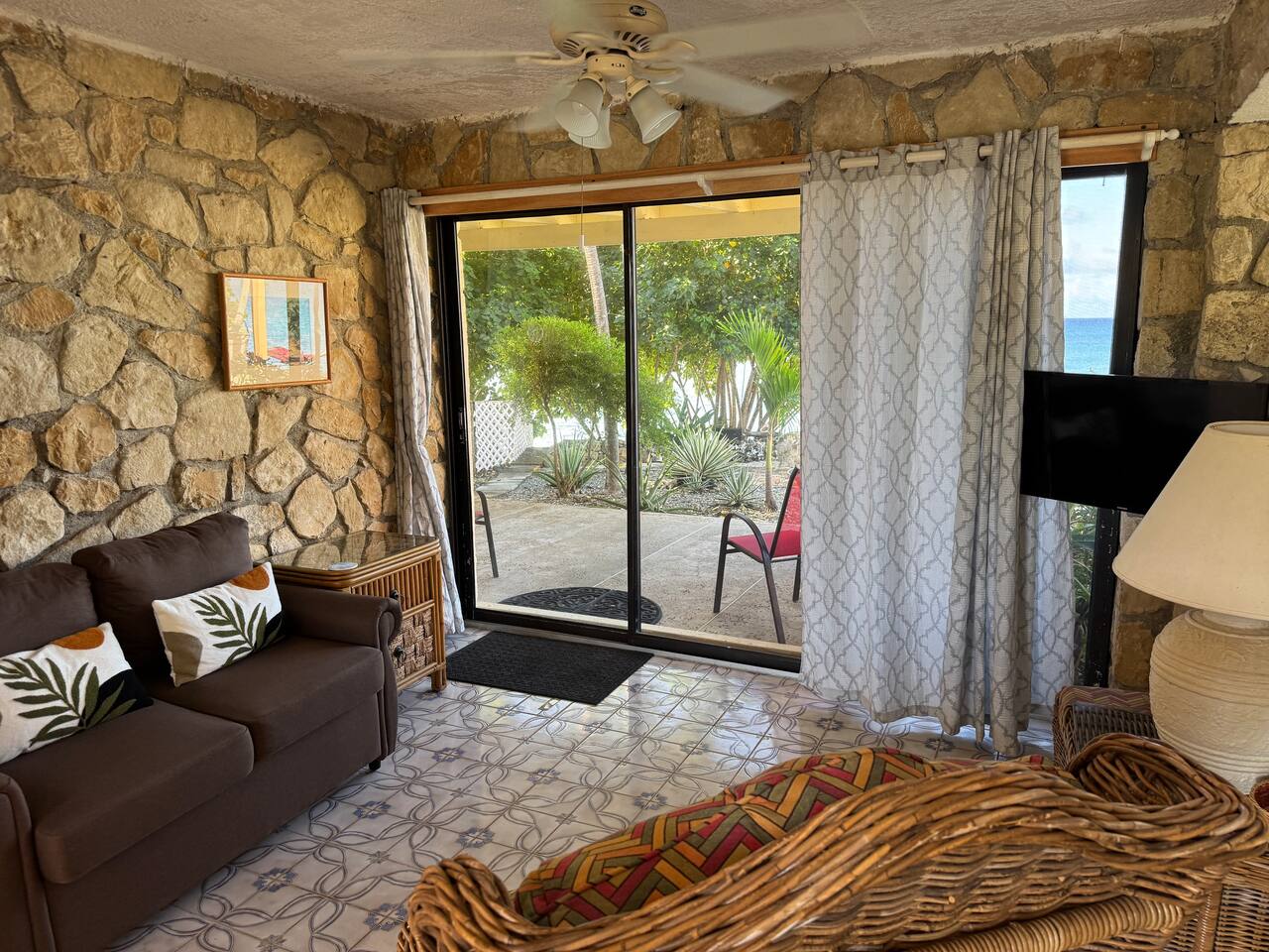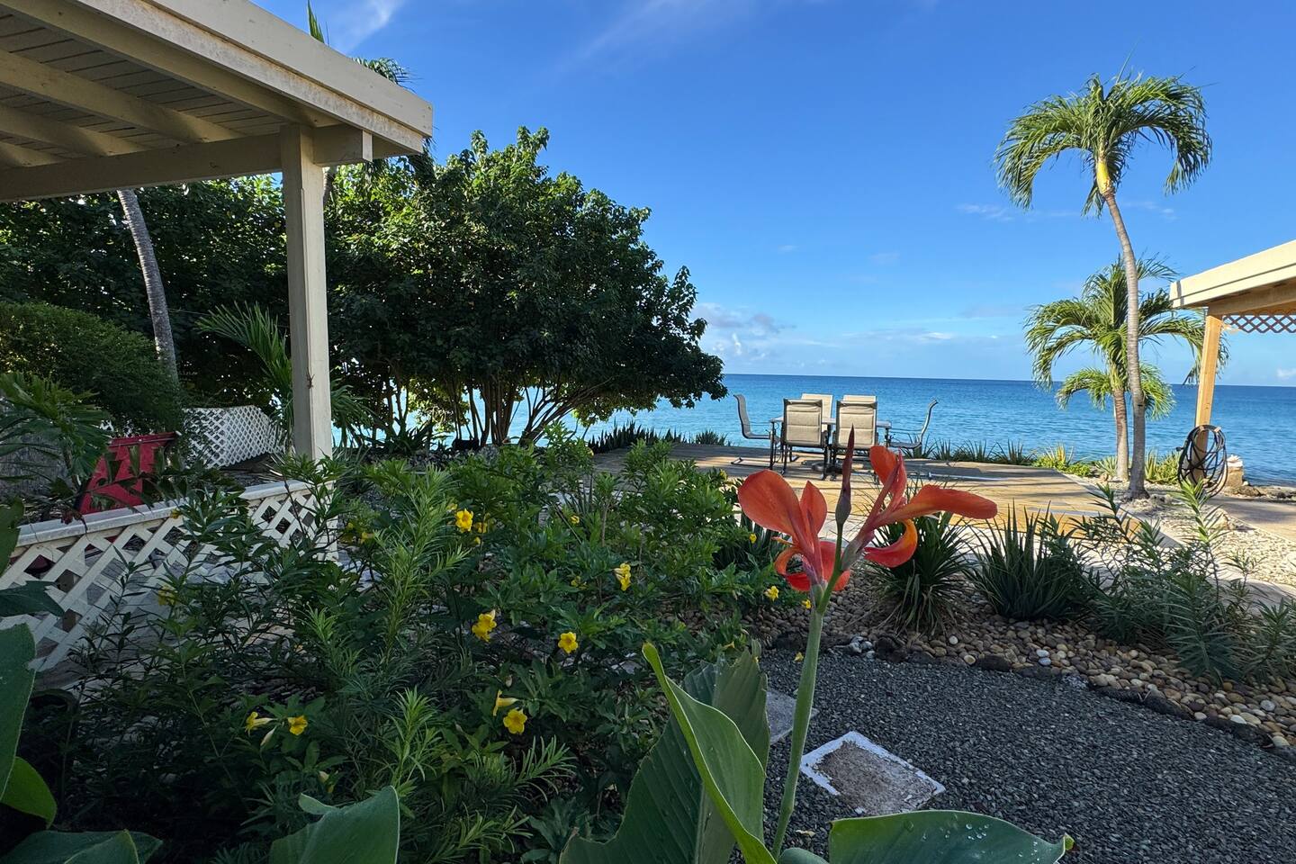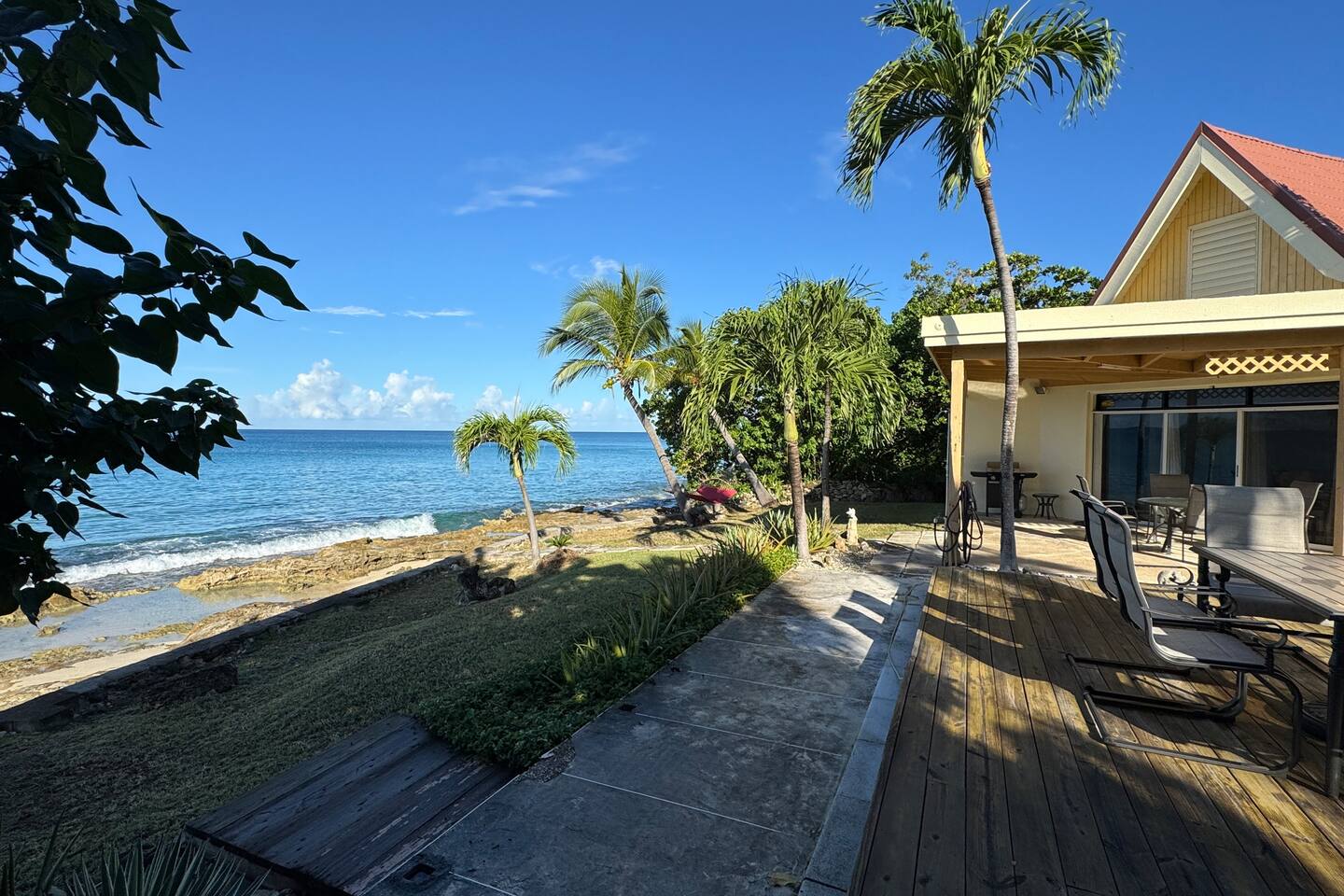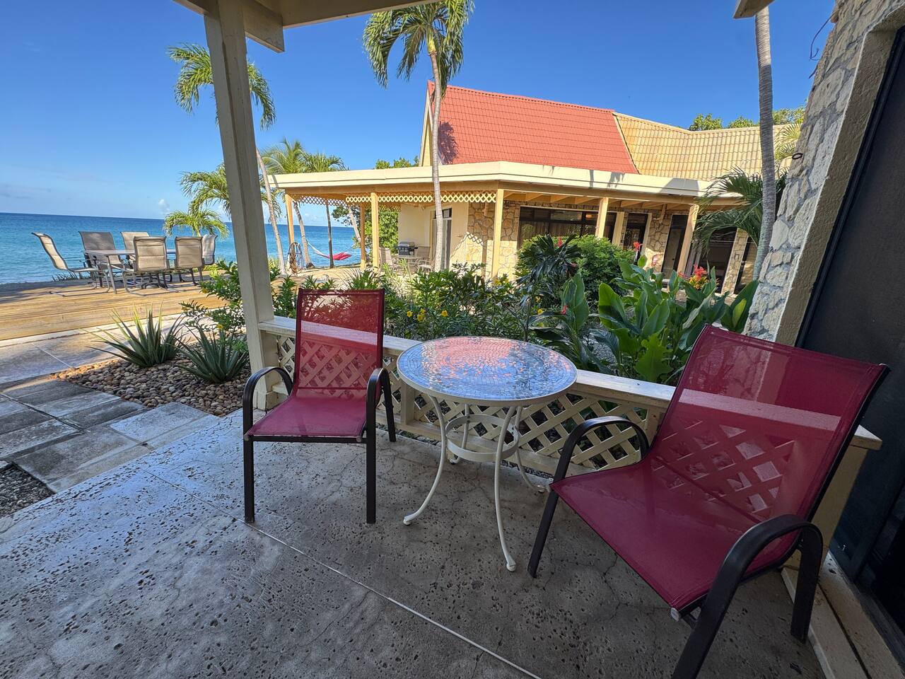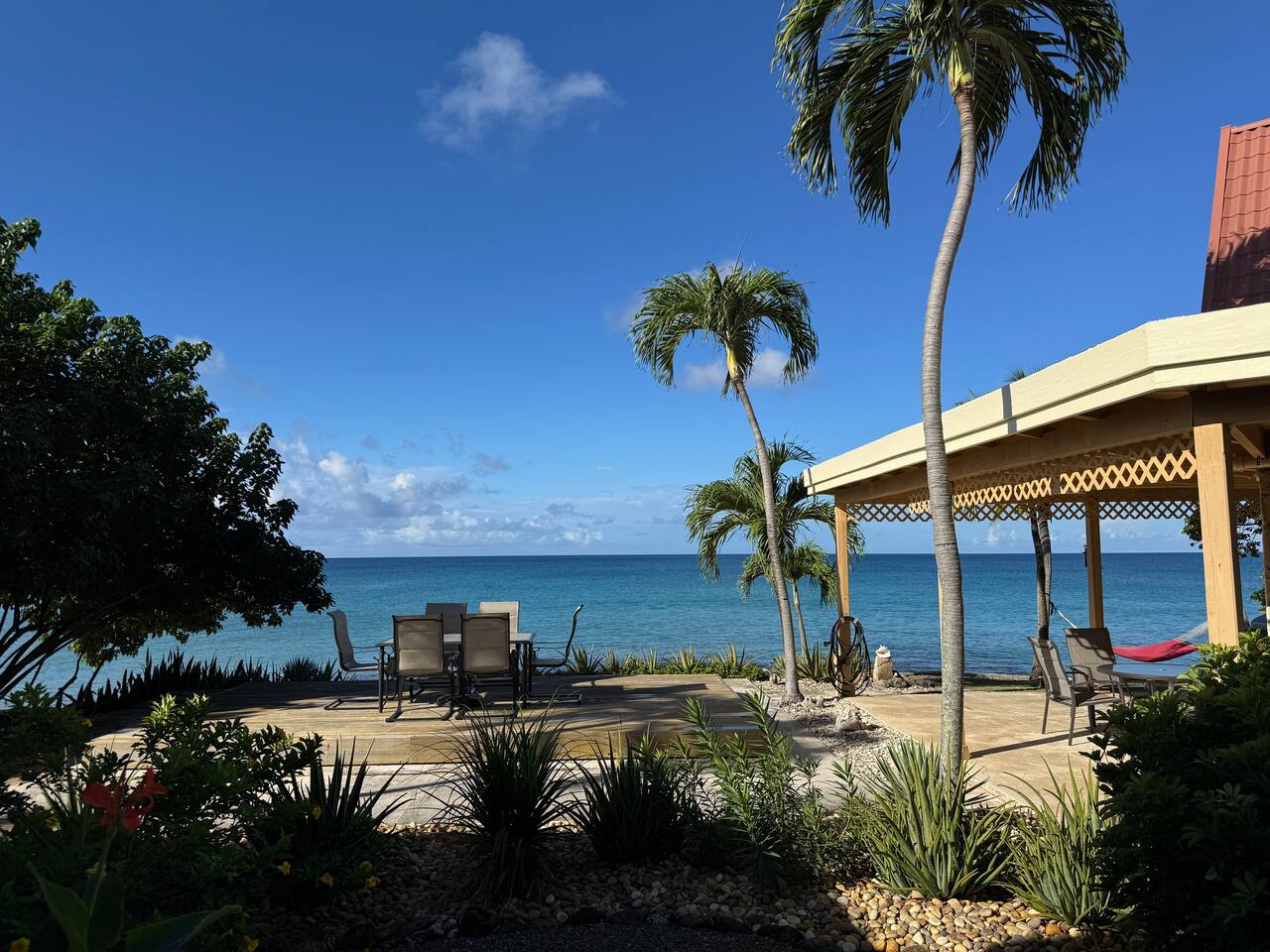 Welcome to our Beachfront Villa—where swimming is easy and stunning sunsets are endless. Perfect for families and friends of all ages, it sits on the sandy West End of St. Croix, just a short walk from historic Frederiksted. Two charming stone houses share a private walled courtyard, steps from the sandy beach. Swim, snorkel, fish, or simply relax on the shaded porch and take in the Caribbean view. Enjoy the laid-back beauty of island life at our Oceanfront Villa.
